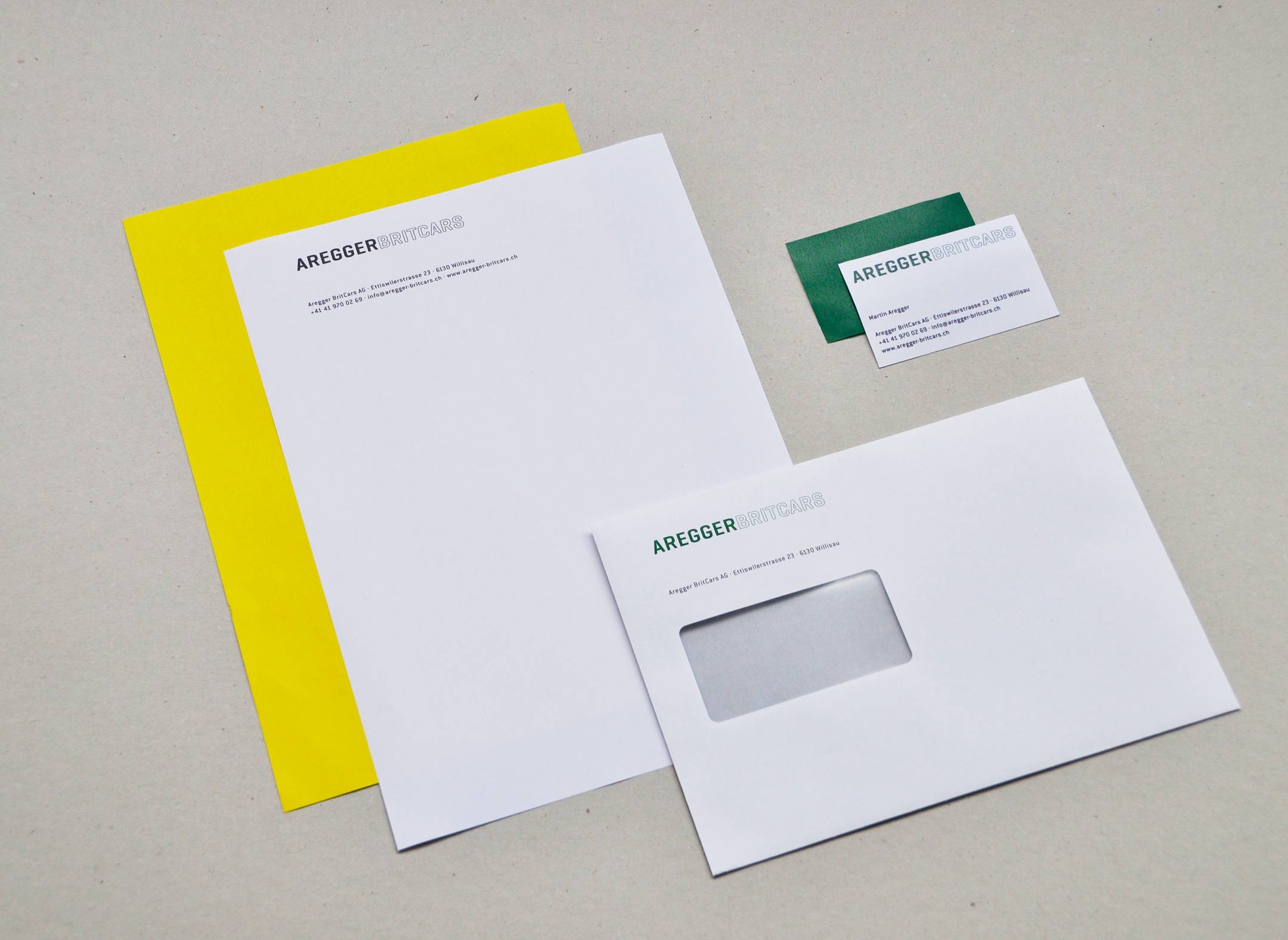 Für Aregger Britcars haben wir das Logo und die Briefschaft gestaltet. Die stark vertretene Marke «Lotus» spiegelt sich im Grün und Gelb der Briefschaft wieder. Der Outline-Font kommt vor allem bei der Autobeschriftung zur Geltung, wenn die jeweilige Autofarbe den Font ausfüllt und somit personalisiert.