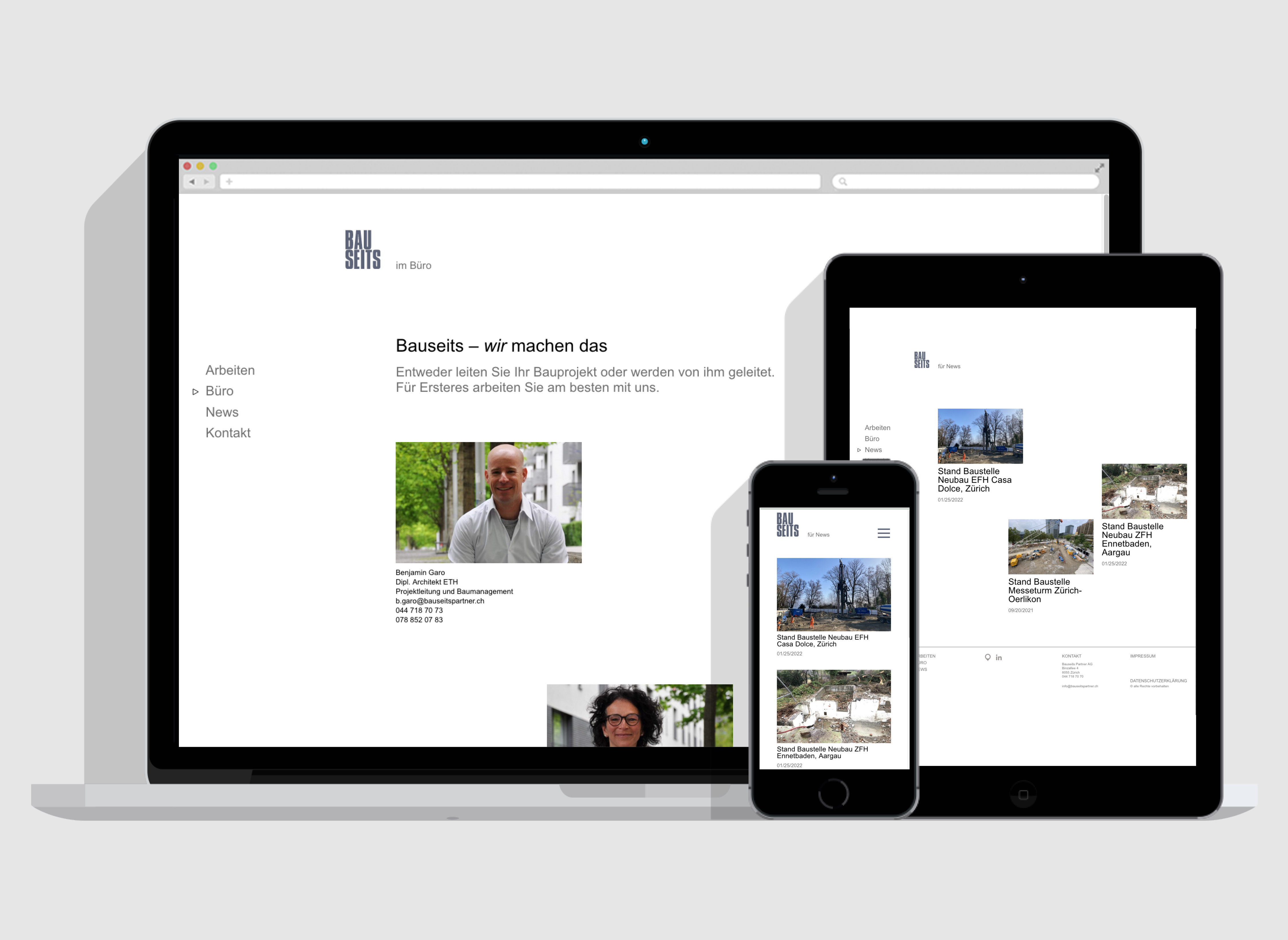 Für Bauseits Partner AG haben wir in Zusammenarbeit mit Peter Eisenegger, ferric worx eisenegger gmbh, die gesamte Kommunikation entwickelt und das Corporate Design gestaltet. Vom Logo, der Briefschaft, dem Webauftritt bis hin zur Bautafel spielt der griffige Name «Bauseits» mit diesem in der Baubranche allgegenwärtigen Thema. Der Name wird durch den Claim «Wir machen das» ergänzt und unterstreicht die Dienstleistung unseres Kunden.