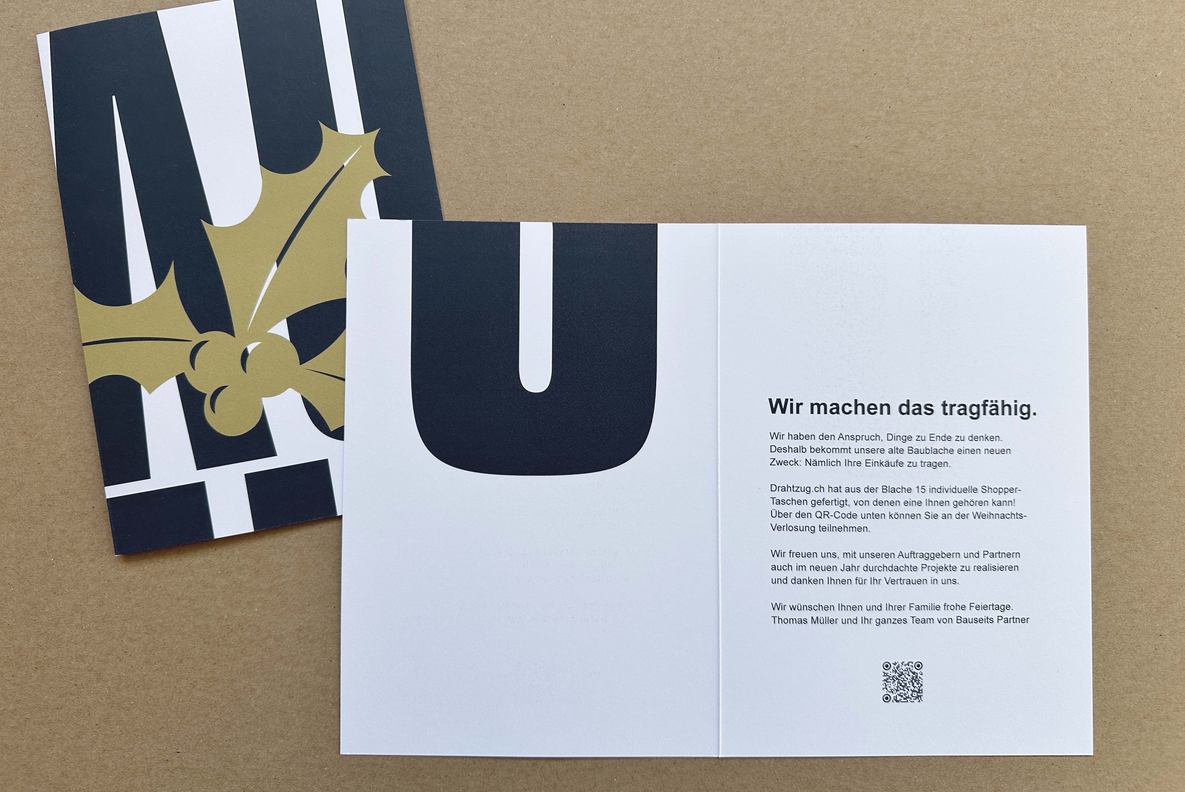 Die Weihnachts- und Neujahrsgrüsse von Bauseits Partner AG sind jedes Jahr speziell: 2023 wurden 30 Shopper aus den alten Baublachen hergestellt und verlost. Ganz im Gedanken von a second life für Baustoffe.