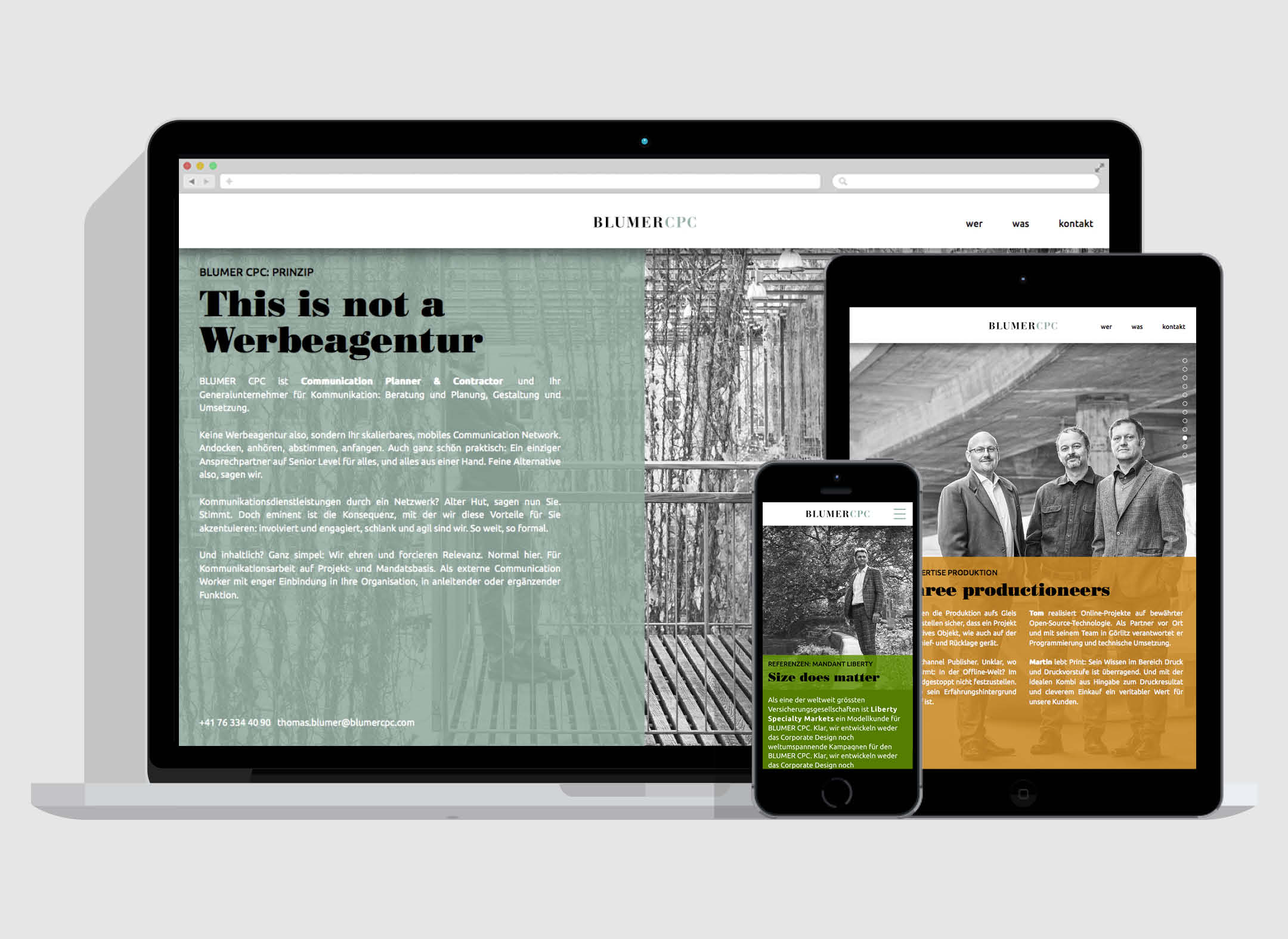 Für BLUMER CPC, einen unserer Netzwerk-Partner und GU für Kommunikation, entwickelten wir Corporate Design und Webauftritt. Eine Arbeitsweise mit sehr persönlichem und unprätentiösem Approach, sowie klare formale und inhaltliche Ansagen sollen dabei zum Ausdruck kommen.