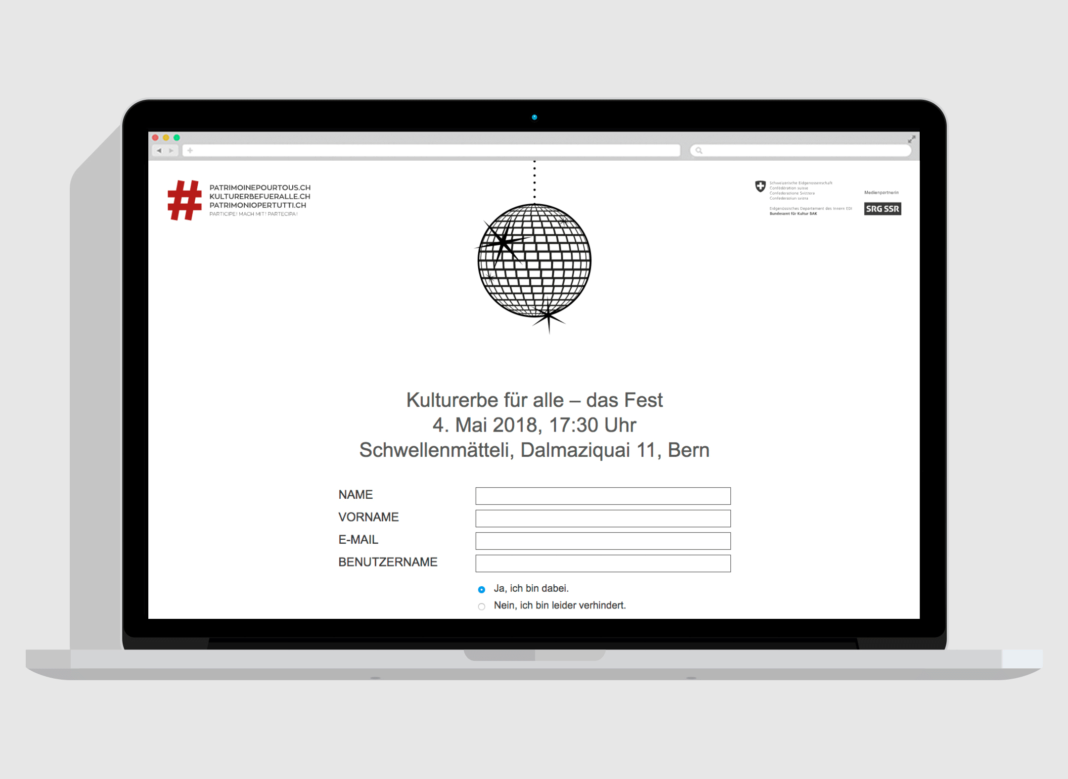 Das Bundesamt für Kultur lancierte im Kulturerbejahr 2018 den offenen Ideenwettbewerb «Kulturerbe für alle». Zum Abschluss des Ideenwettbewerbs gab es für alle Teilnehmer ein Fest mit Ehrung der Gewinner. Für diesen Anlass haben wir die animierte Online-Einladung und die Anmeldungsmöglichkeit auf einer Landingpage gemäss dem bestehenden Auftritt gestaltet und realisiert.