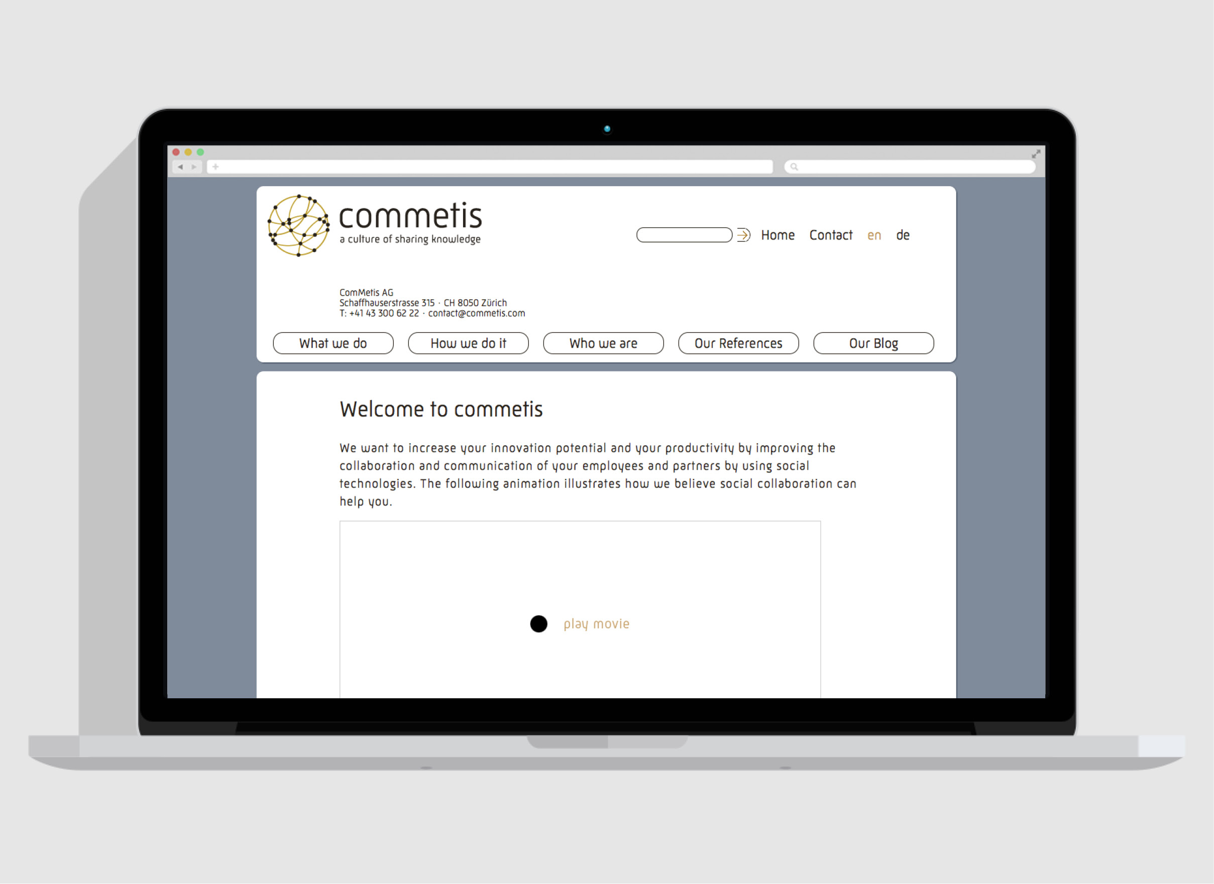 Commetis AG findet Lösungen, das gemeinsam bestehende Wissen und die Kompetenzen eines Unternehmens allen Mitarbeitern zugänglich zu machen. Sei es im gleichen Gebäude, an mehreren Standorten im Land oder weltweit. Für Commetis konnten wir das gesamte Corporate Design entwickeln.