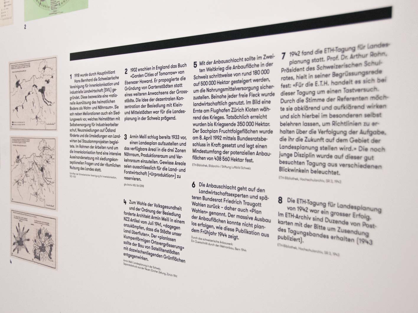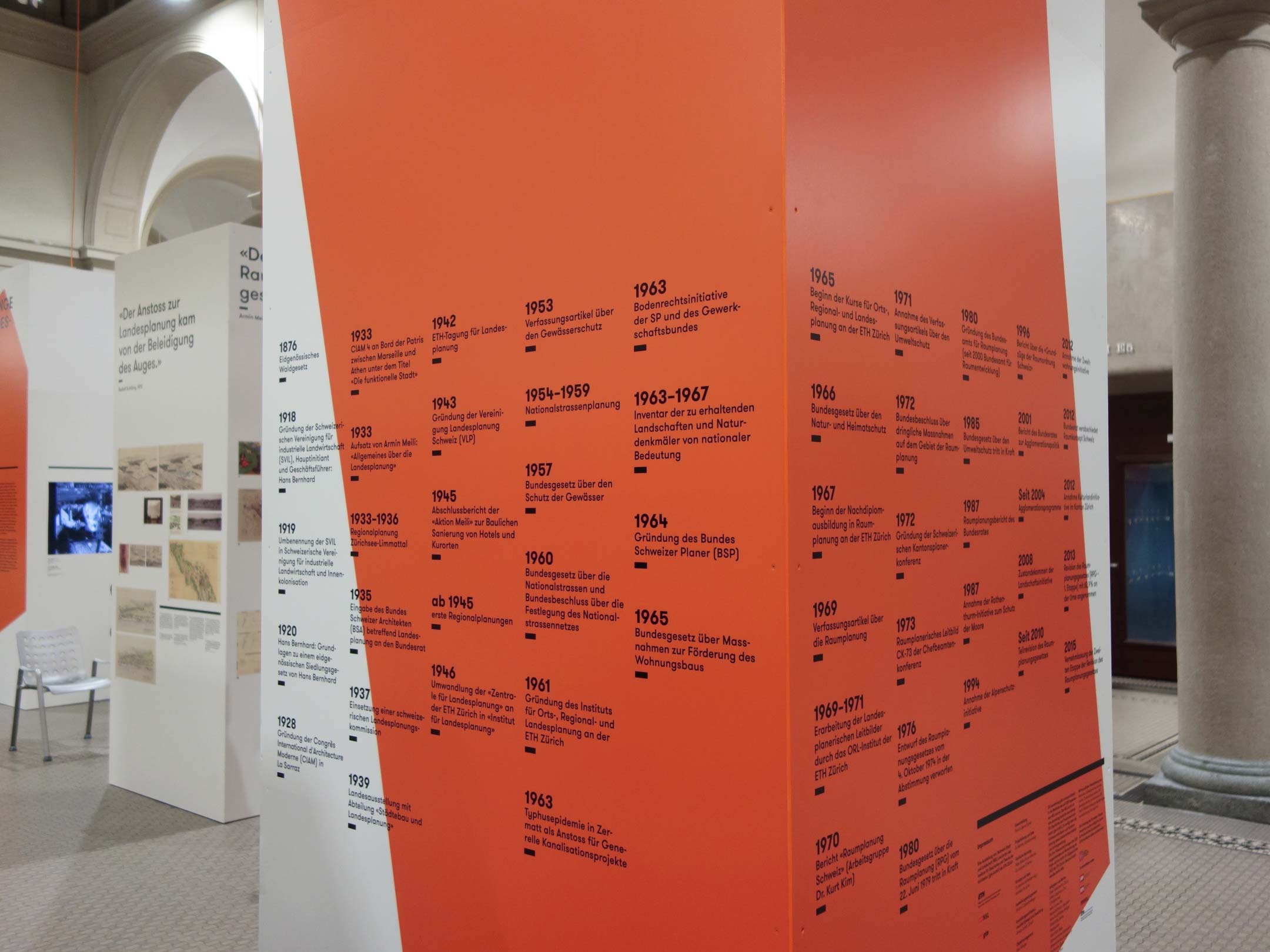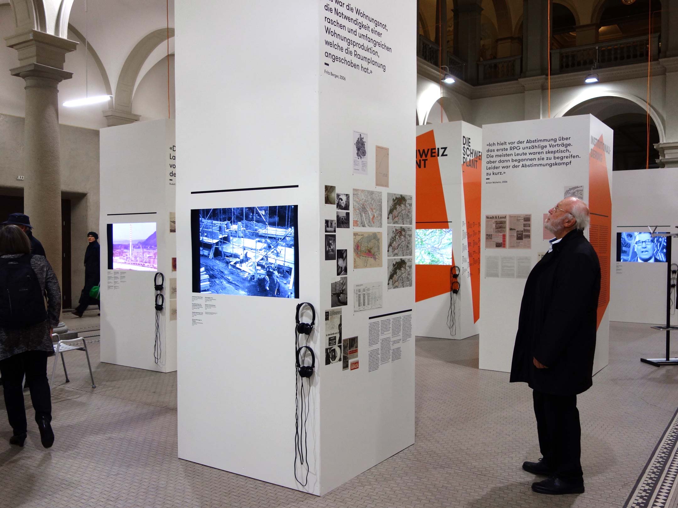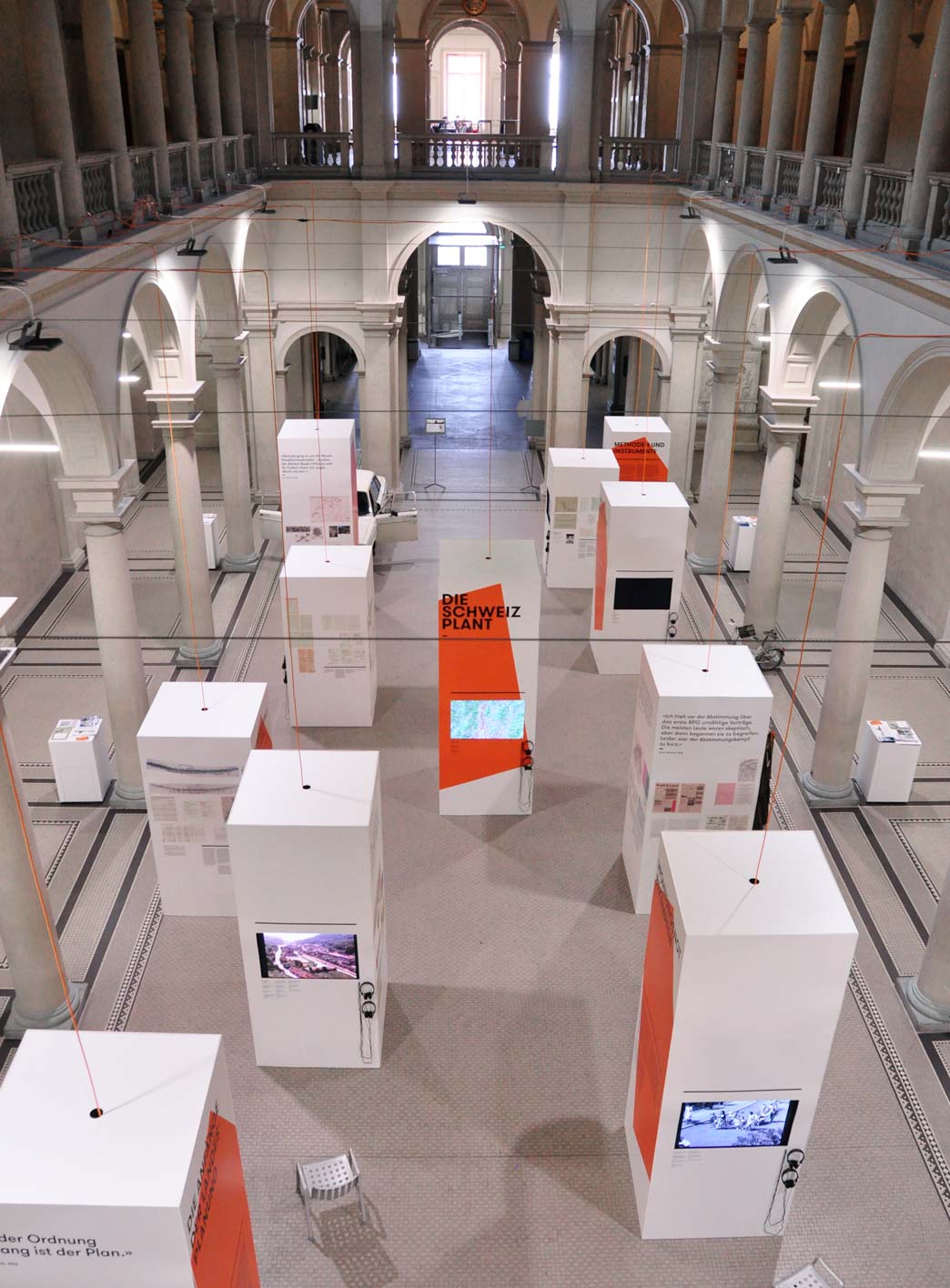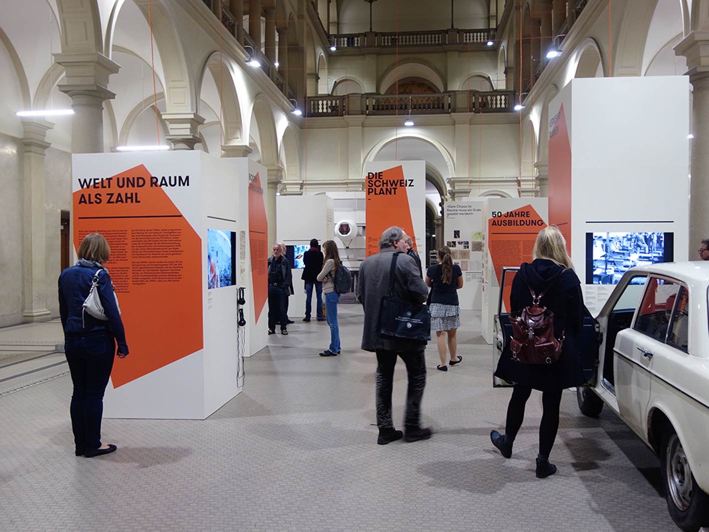 Anlässlich des 50-Jahre-Jubiläums der Raumplanungsausbildung veranstaltet die ETH Zürich eine Ausstellung. Das von uns entwickelte Ausstellungskonzept mit unterschiedlich hohen weissen Kuben bildet eine Stadtlandschaft, die den gesamten Raum der ausladenden Halle bespielt und so das Thema Raumplanung direkt erfahrbar macht. Auf den zwölf Kuben wird – anhand von Planmaterial und Filmdokumenten aus dem Archiv – je ein Aspekt der Raumplanung beleuchtet. Die orangen Flächen visualisieren dabei das Spannungsfeld zwischen der Planung auf dem zweidimensionalen Plan und der realen Ausführung im Raum. Sie bilden zudem ein auffallendes Keyvisual, das in der gesamten Ausstellungskommunikation verwendet wird.