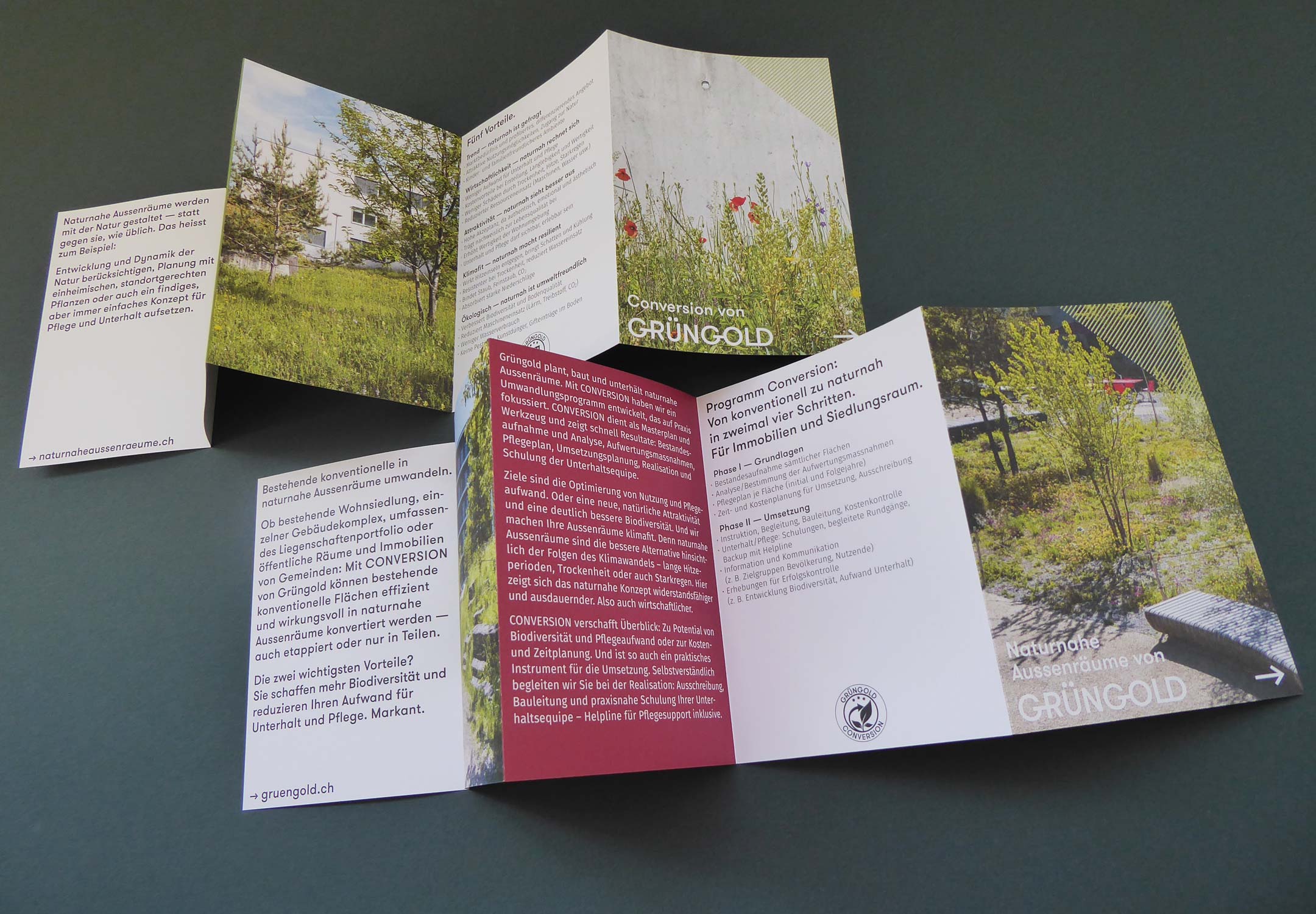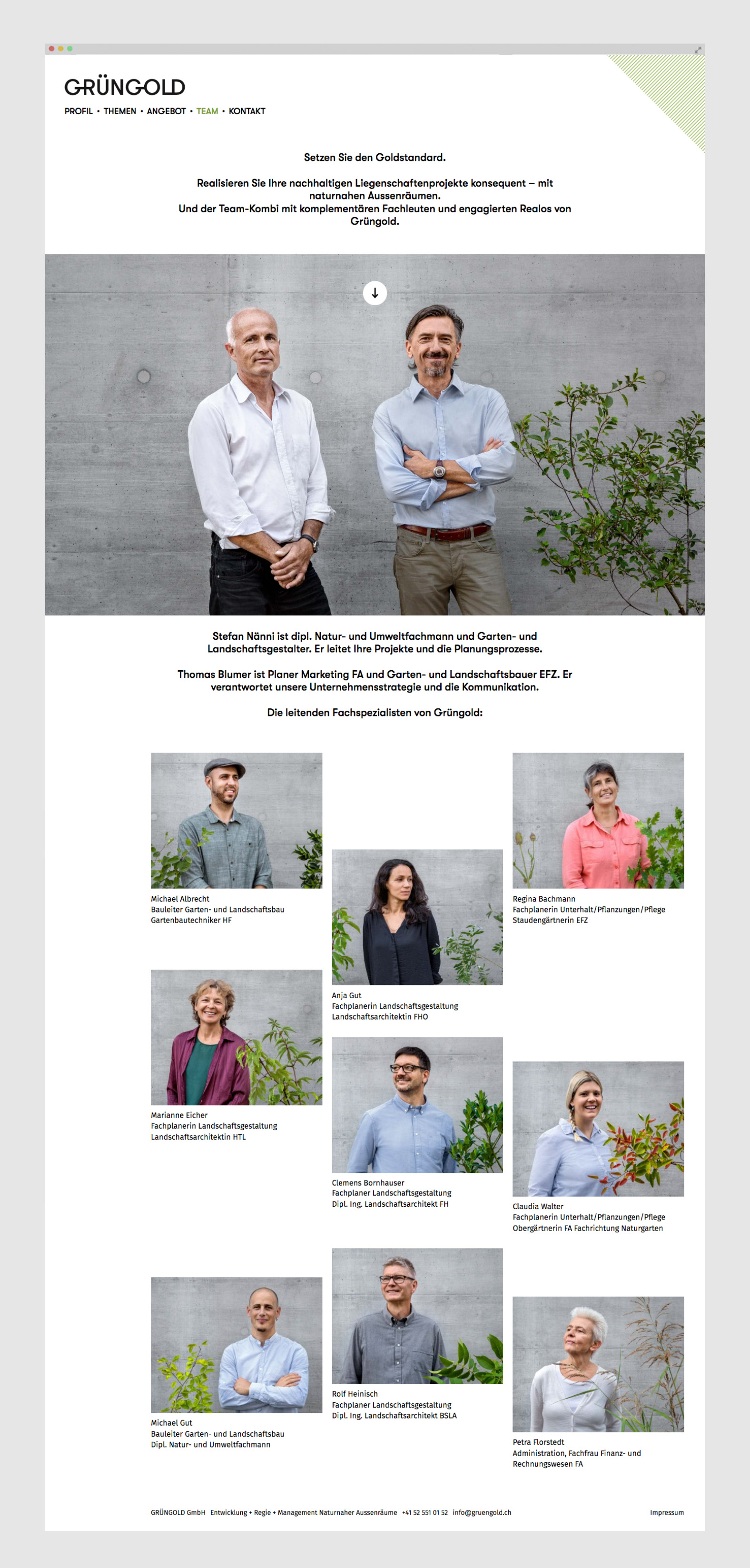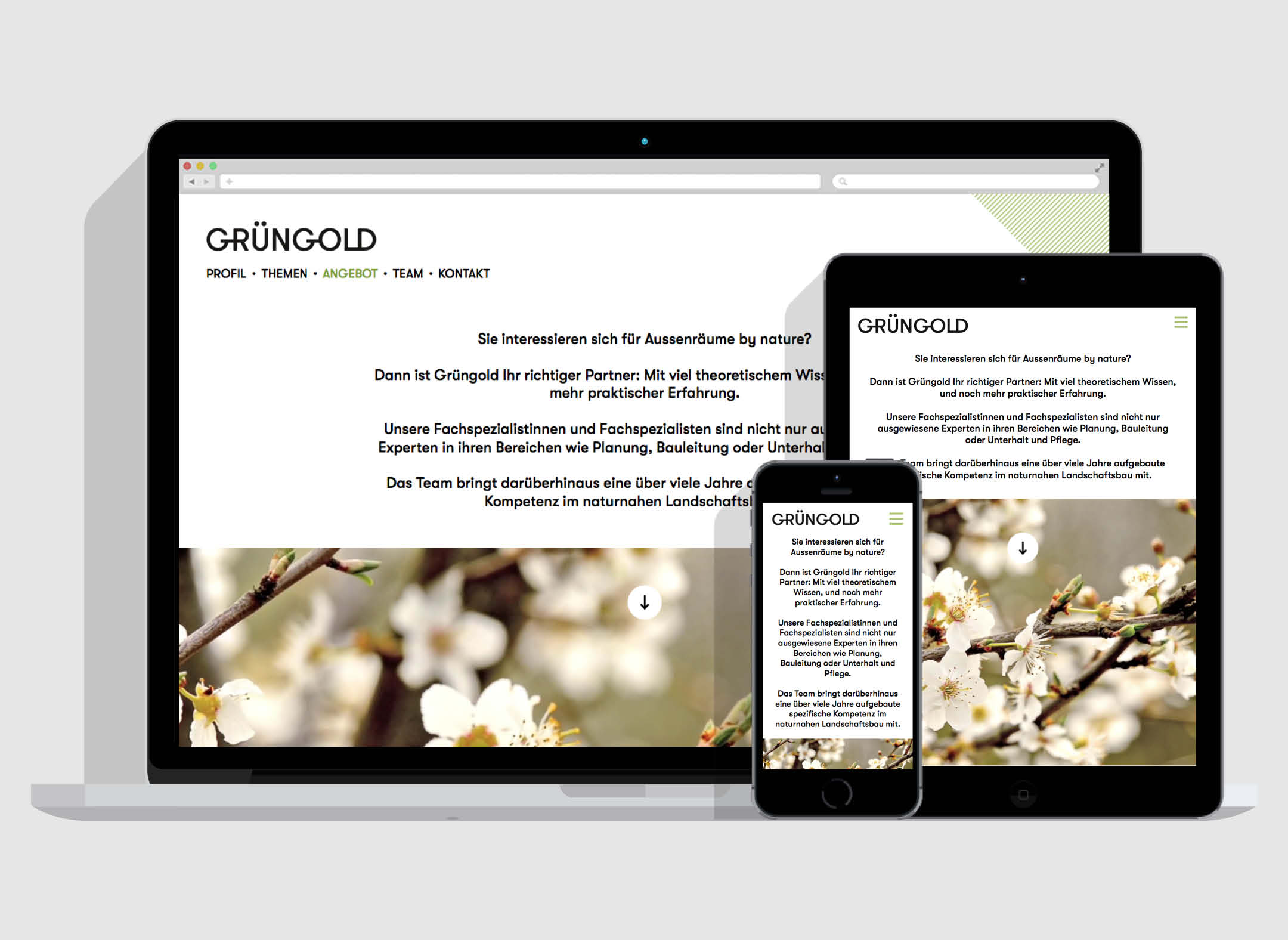 Grüngold GmbH plant, baut und unterhält naturnahe Aussenräume und schafft damit attraktive und ökologische Lebensräume für grössere Immobilienprojekte. Wir haben das Corporate Design gestaltet und realisiert: Vom schlichten Schriftzug über knackige Visuals bis hin zum frischen Online-Auftritt mit stimmungvollen, bewegten Naturbildern.