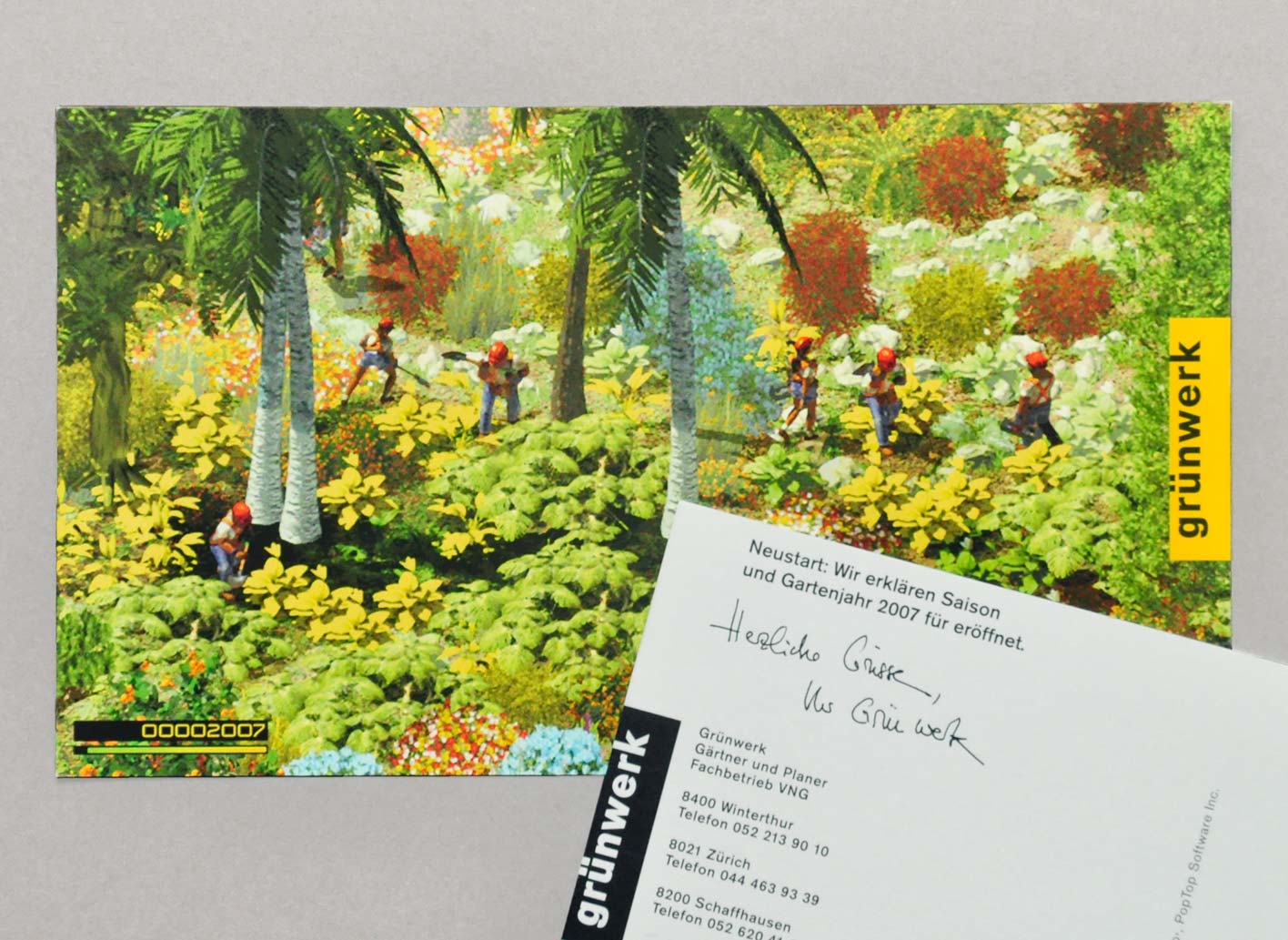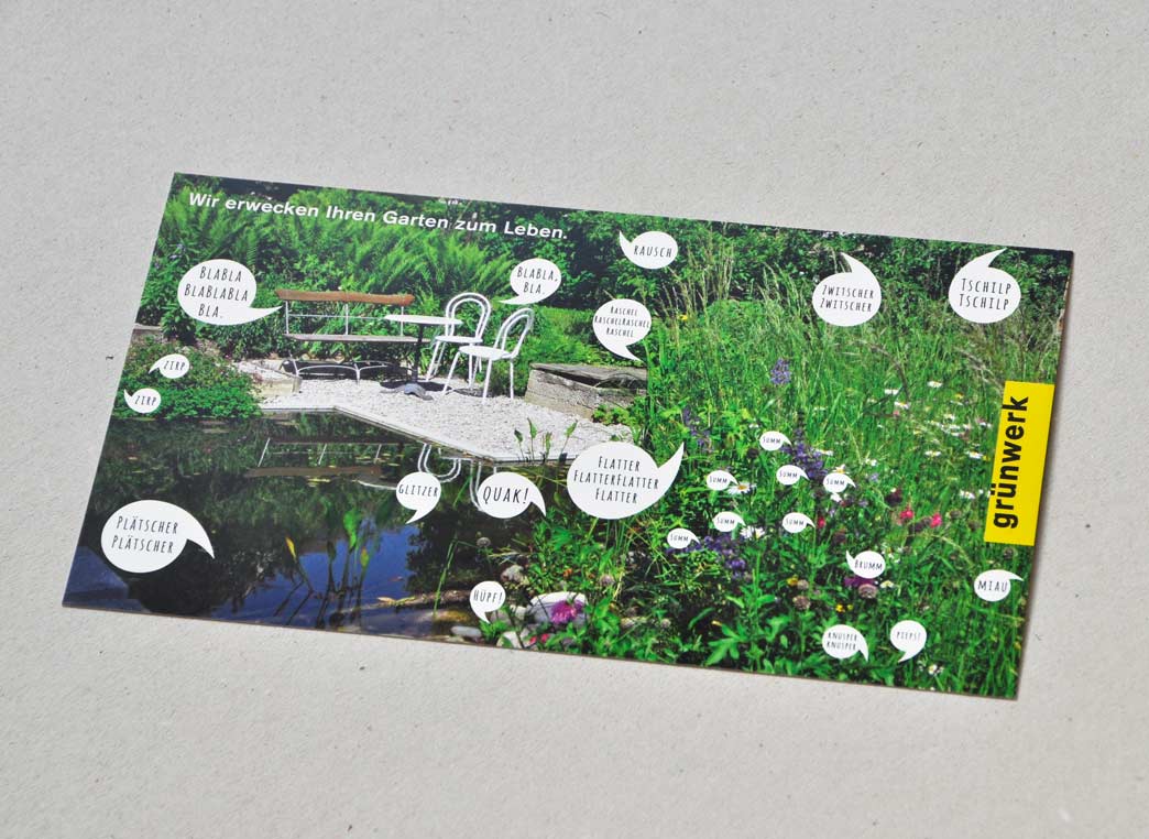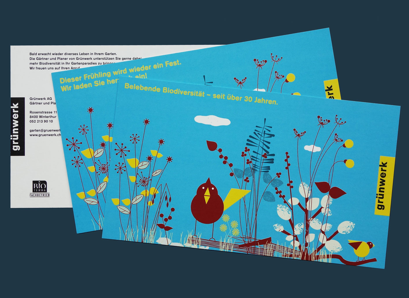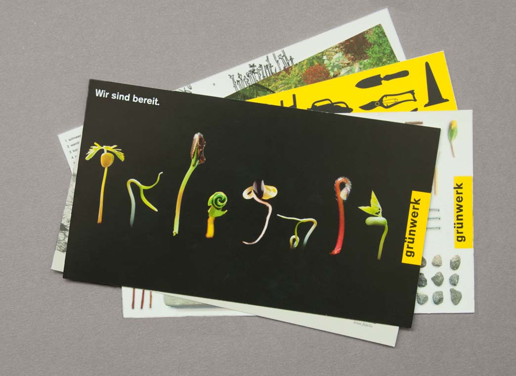 Grünwerk plant, baut und pflegt seit 1989 naturnahe Gärten und Gartenanlagen. Und Driven seit 2004 den visuellen Auftritt. Die alljährlich im Frühjahr erscheinenden Postkarten und Inserate nehmen jeweils auf humorvolle Weise Aspekte des naturnahen Gartenbaus auf – in einer immer wieder neuen gestalterischen Umsetzung. 2016 dient das Sujet ausserdem als Hintergrundbild für den Stand an der «art garden winterthur».