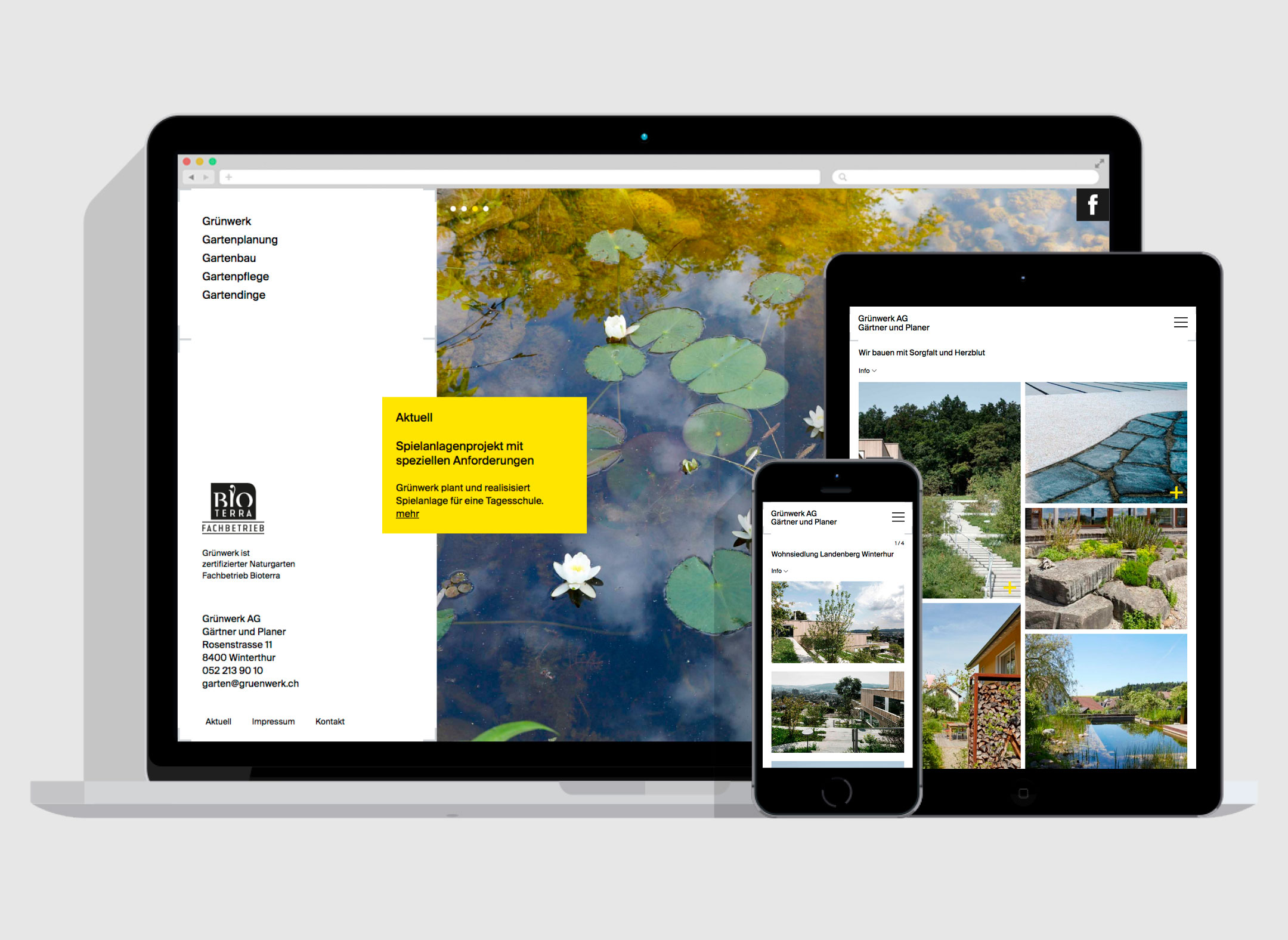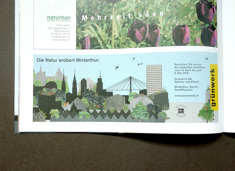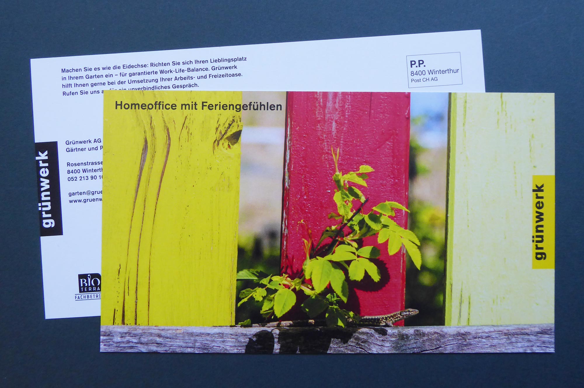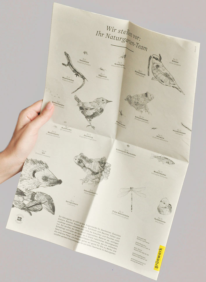 Grünwerk plant, baut und pflegt seit 1989 naturnahe Gärten und Gartenanlagen. Und Driven seit 2004 den visuellen Auftritt. Die alljährlich im Frühjahr erscheinenden Postkarten und Inserate nehmen jeweils auf humorvolle Weise Aspekte des naturnahen Gartenbaus auf – in einer immer wieder neuen gestalterischen Umsetzung. 2016 dient das Sujet ausserdem als Hintergrundbild für den Stand an der «art garden winterthur».