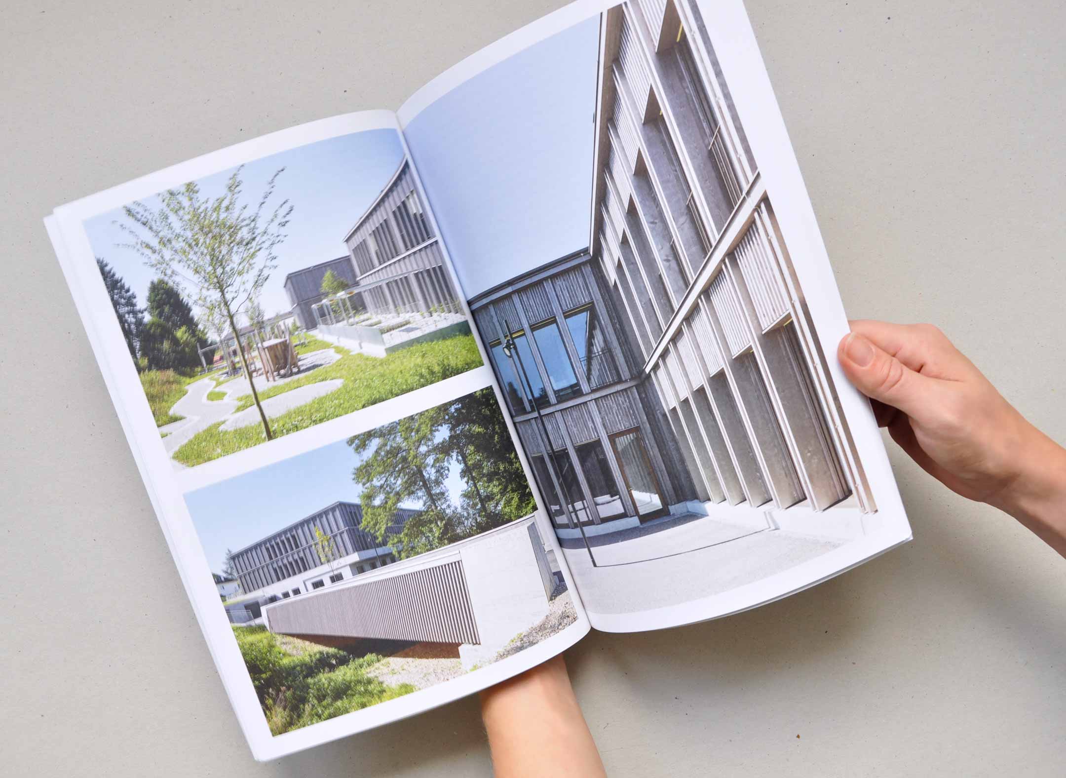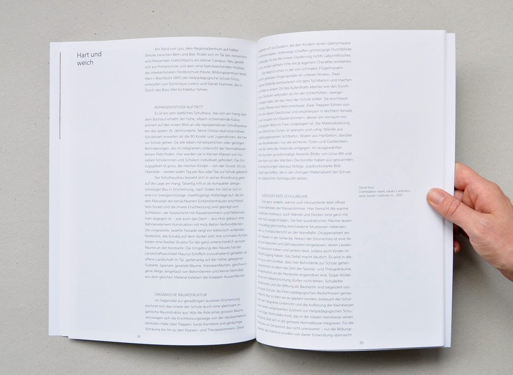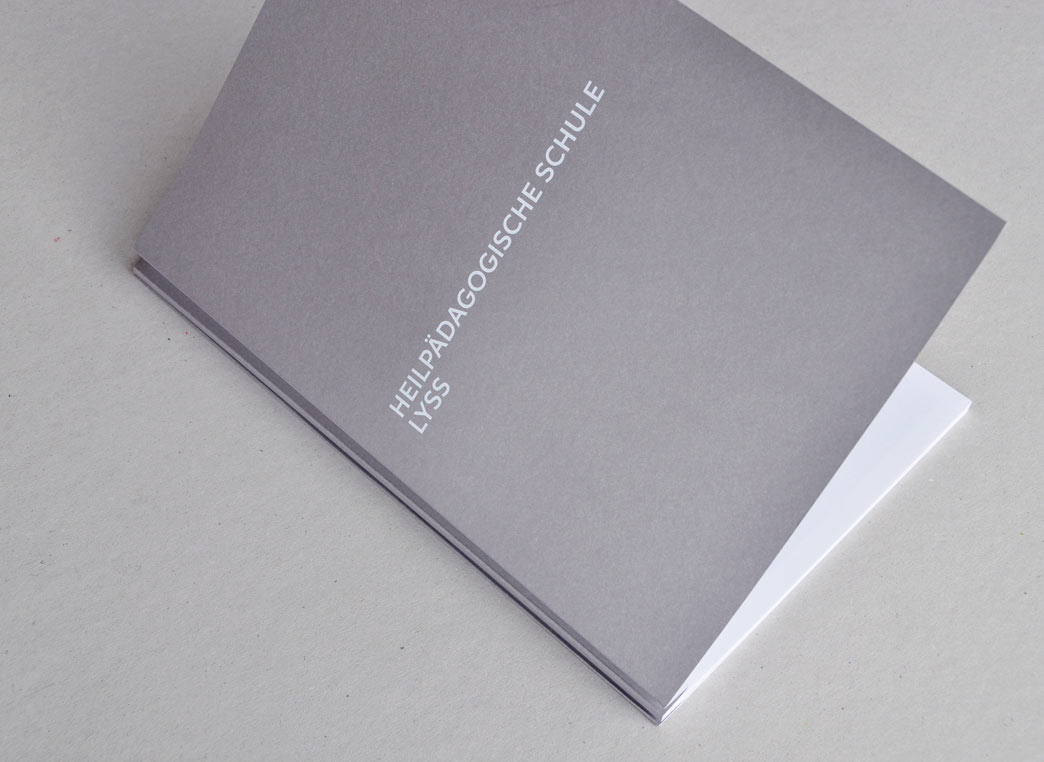 Für den Neubau der Heilpädagogischen Schule in Lyss haben wir die Baudokumentation konzipiert und realisiert. Der Umschlag der Broschüre interpretiert mit der speziellen Falzung und Farbe die Holzfassade des Gebäudes. Auch die wunderbare Kunst am Bau – eine Weiterentwicklung der Künstler von 300 Kinderzeichnungen – findet nebst vielen Innenansichten grosszügig Platz. Architektur: met Architektur, Zürich.