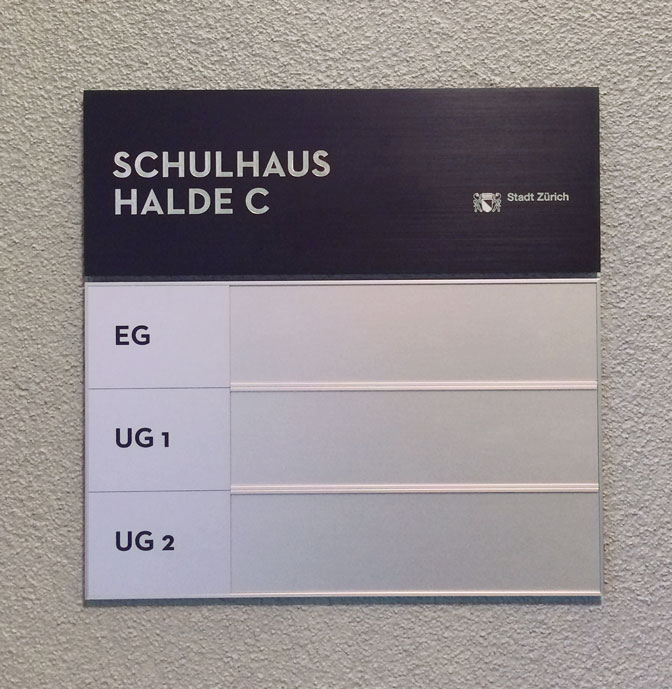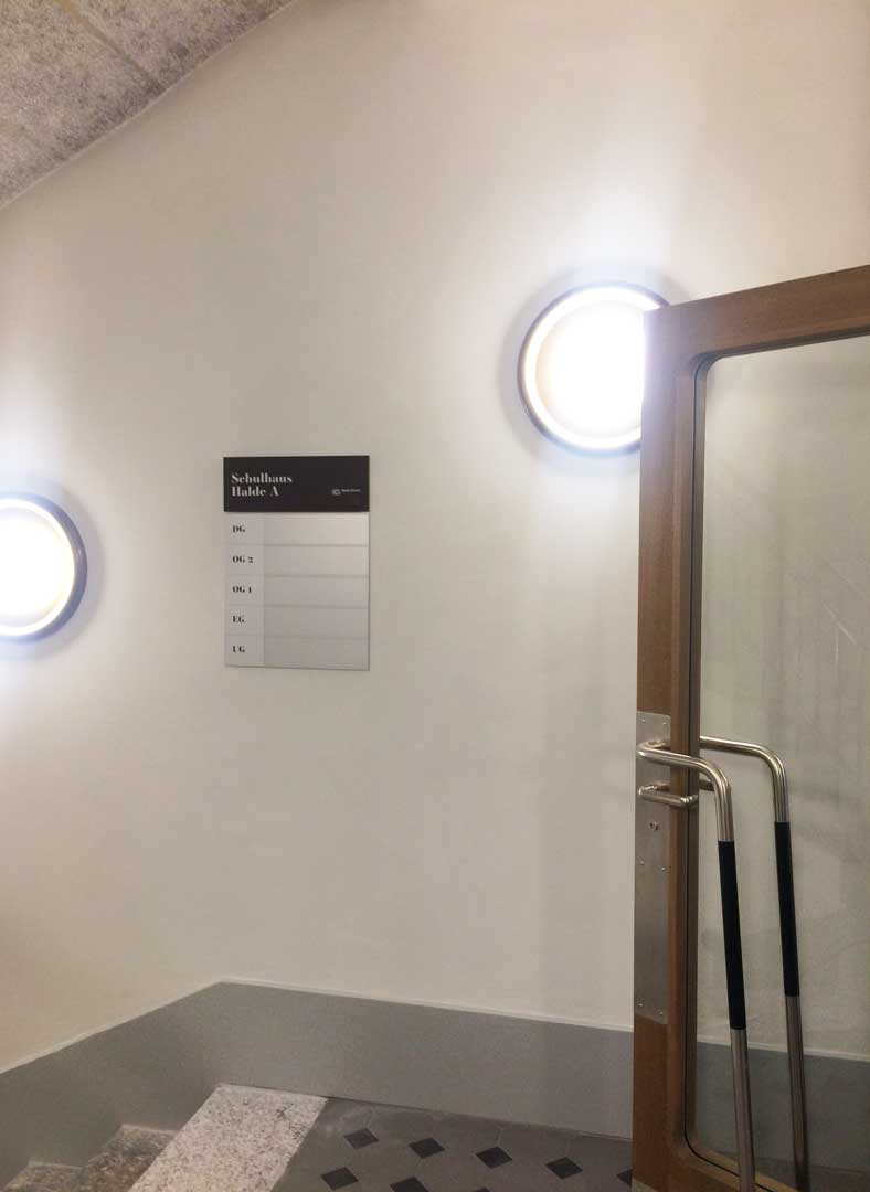 Für die beiden Schulhäuser Halde A und C (Kindergarten, Schulbetrieb und Betreuung) wurden wir mit der Planung und Realisierung der Signaletik beauftragt. Die beiden Schulhäuser aus verschiedenen Zeit-Epochen wurden unter den Aspekten der Denkmalpflege