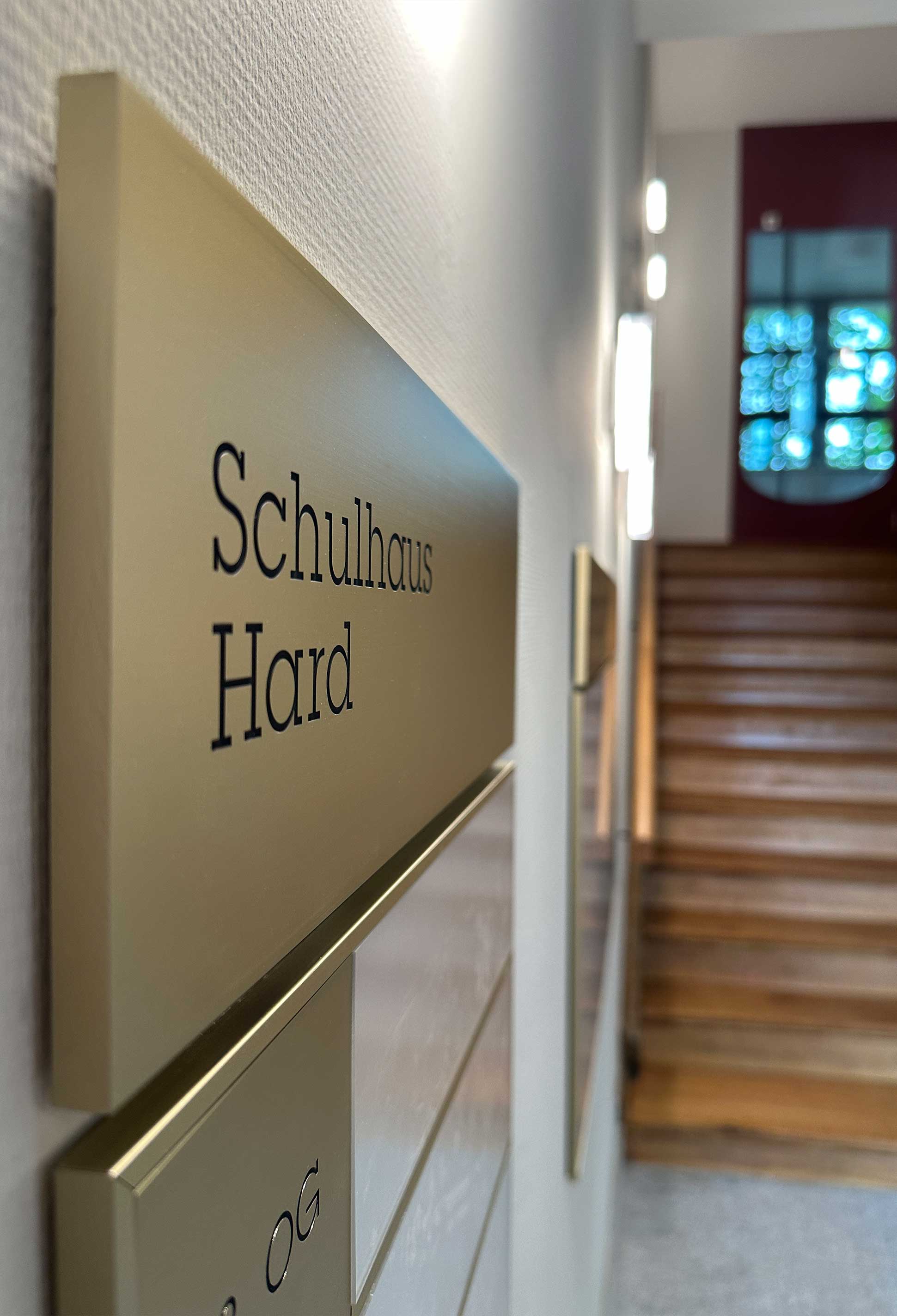 Das Schulhaus Hard wurde komplett saniert. Driven hat die Signaletik erarbeitet. Das Materailkonzept/Farbgebung der Architektur wurde bei der Beschriftung aufgenommen und weiter interpretiert. Die verwendete Schrift ist eine moderne Interpretation der klassizistischen Antiqua. Sie ist indentitätsstiftend und unterstreicht die Grundformen des Gebäudes. Die Piktogramme sind aus dem Schriftbild abgeleitet. Architektur: Ladner Meier Architekten